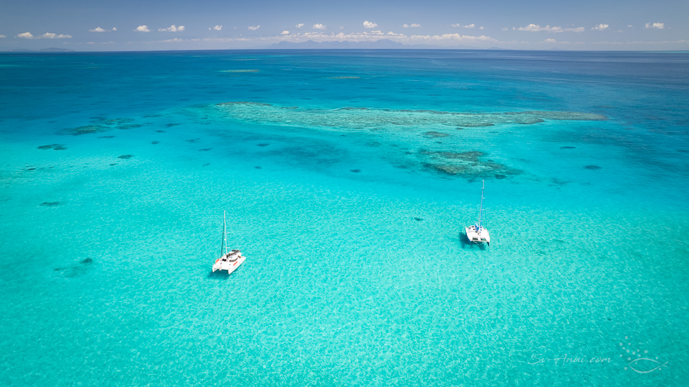 We anchored at a different patch to the one we visited last time, so it counts as a new find! There is not a lot of protection, but in 15-18 knots the anchorage was fine. We were in 4.5m of water at high tide over sand. The intention was to snorkel at low tide the next morning, but we had not counted on rain! Snorkeling in these conditions was not appealing. So we only have a drone shot to show for our visit.