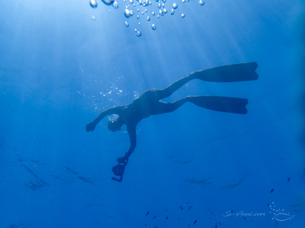 Under our hulls it was nearly as busy. We had the welcoming committee: giant trevallies, batfish, surgeonfish, fusiliers … The GTs were quite inquisitive. Although the water clarity was not great, it was fun to interact with them.