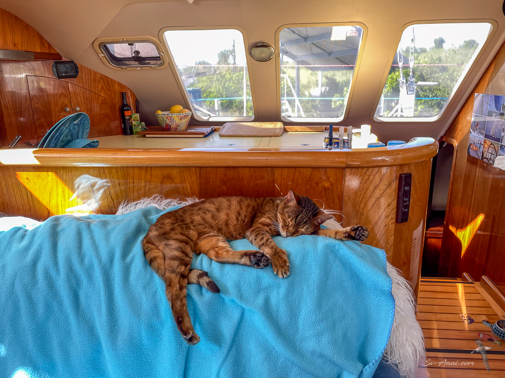 Our splash back was supposed to happen on Wednesday morning but we were obviously not ready to go. We are now wait-listed to go back in the water on Monday the 18th December. There is a number of other boats also waiting. Fingers crossed we can get in! This last week has been particularly hot. The boat is baking on the concrete and life is not very pleasant for us. Our pussycat Bengie has been suffering in the extreme heat too. We keep finding her flaked out wherever she can find a comfy spot.