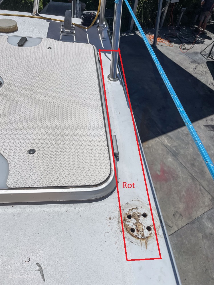 The pulley screws were soaking wet with wood pulp. That’s never a good sign! Tap, tap, tap along the outside edge of the hatch. There was a recognisable dull sound around and down from where the pulley was. Ryan started digging and found a section of the beam the pulley was affixed to was totally rotten. Although the boat construction is foam and fibreglass, hardwood is used where gear such as pulleys, cleats, winches and stanchions are affixed to the deck.