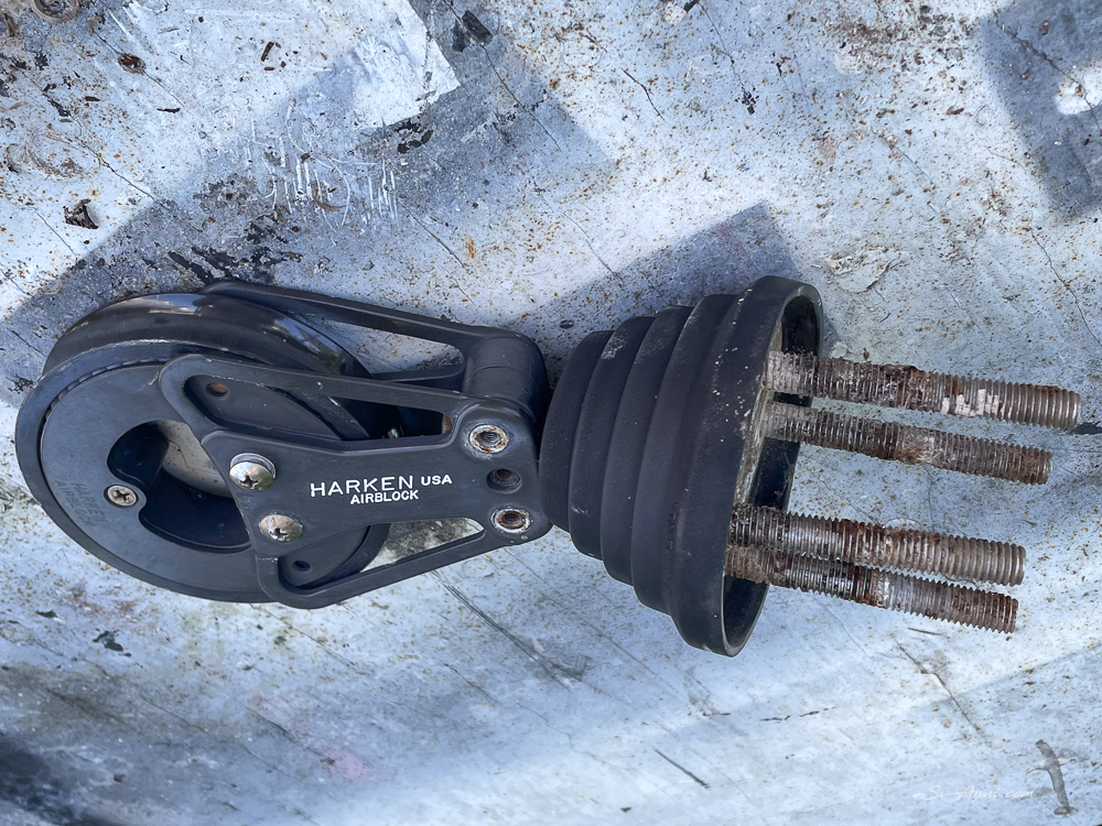 This particular stand up pulley on each side of the boat is the one withstanding the greatest load when we sail under screecher or spinnaker. We are talking tons of pressure so it is a wonder it did not rip off the deck under sail! As we always do when we find something nasty, we bite the bullet and get it fixed properly.