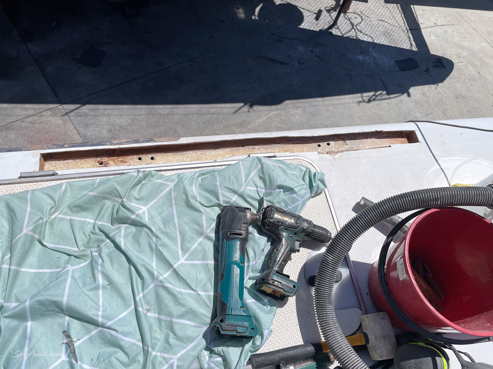 We are in our third week at the Boat Works. Just when we thought we were going swimmingly well, our shipwright investigated the area of delamination and found a surprise for us: some rot to cut out!