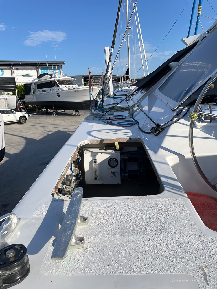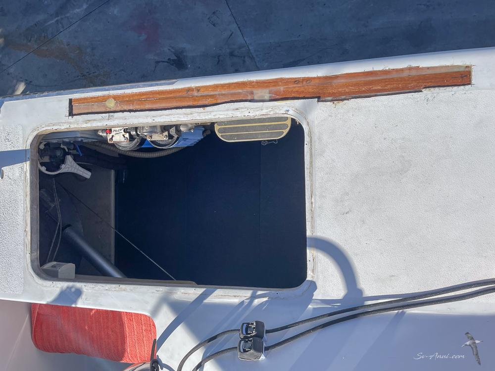 Ryan Thacker who runs 143 Boat Building has been our shipwright for six years. He has been fantastic and we rely on him for Anui’s maintenance. We recommend him to other cruisers without hesitation. We were concerned about an area of possible delamination near the port engine hatch and had brownish water drips coming inside the hatch under a stand up pulley block, which Wade removed. We asked Ryan to have a look.