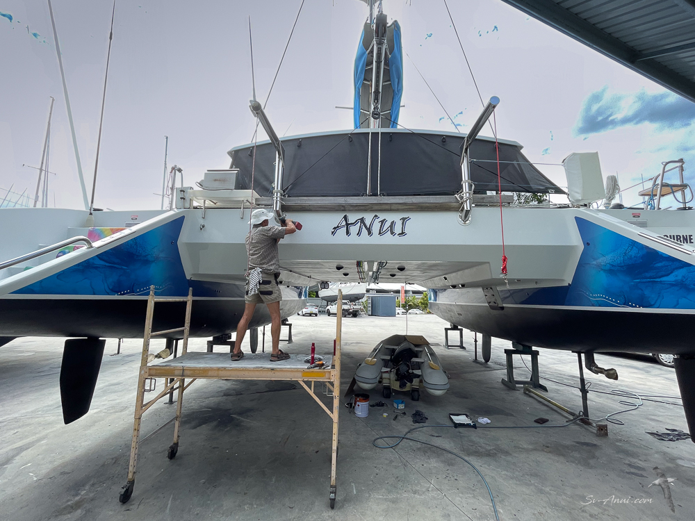 • Chris at Shine Stainless Steel repaired and strengthened the davits and welded the dinghy hole in the aluminium hull we had temporarily patched back at Hinchinbrook