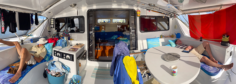 Chris managed to do a stretch session on deck afterwards on both days. The boys were a bit less active after our big walks: passed out having a snooze in the cockpit!
