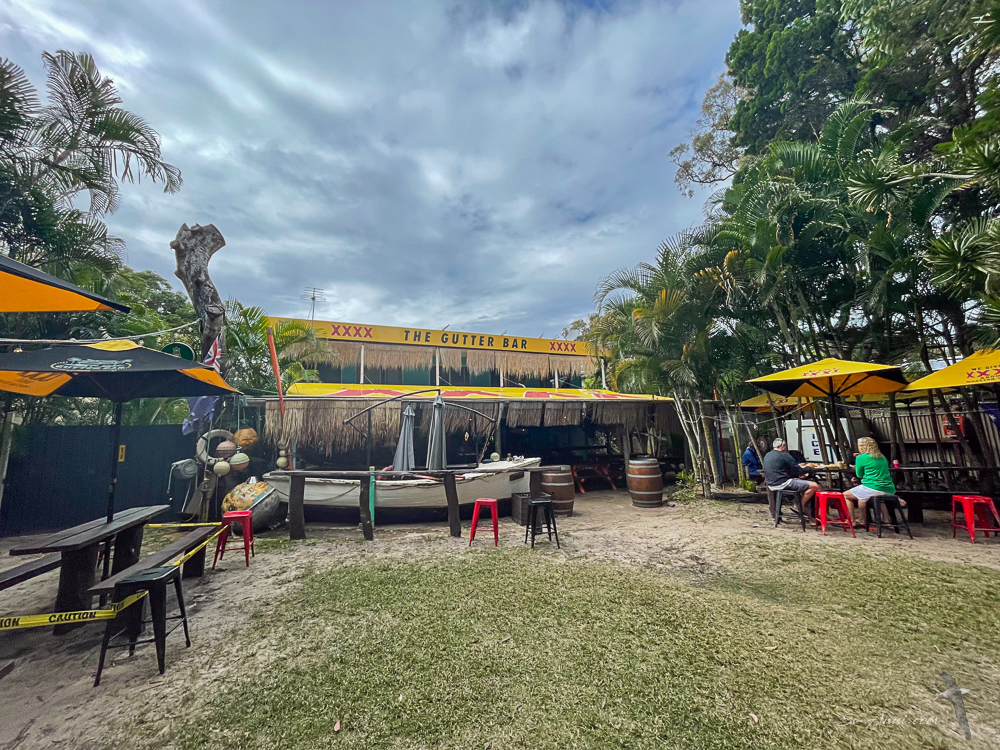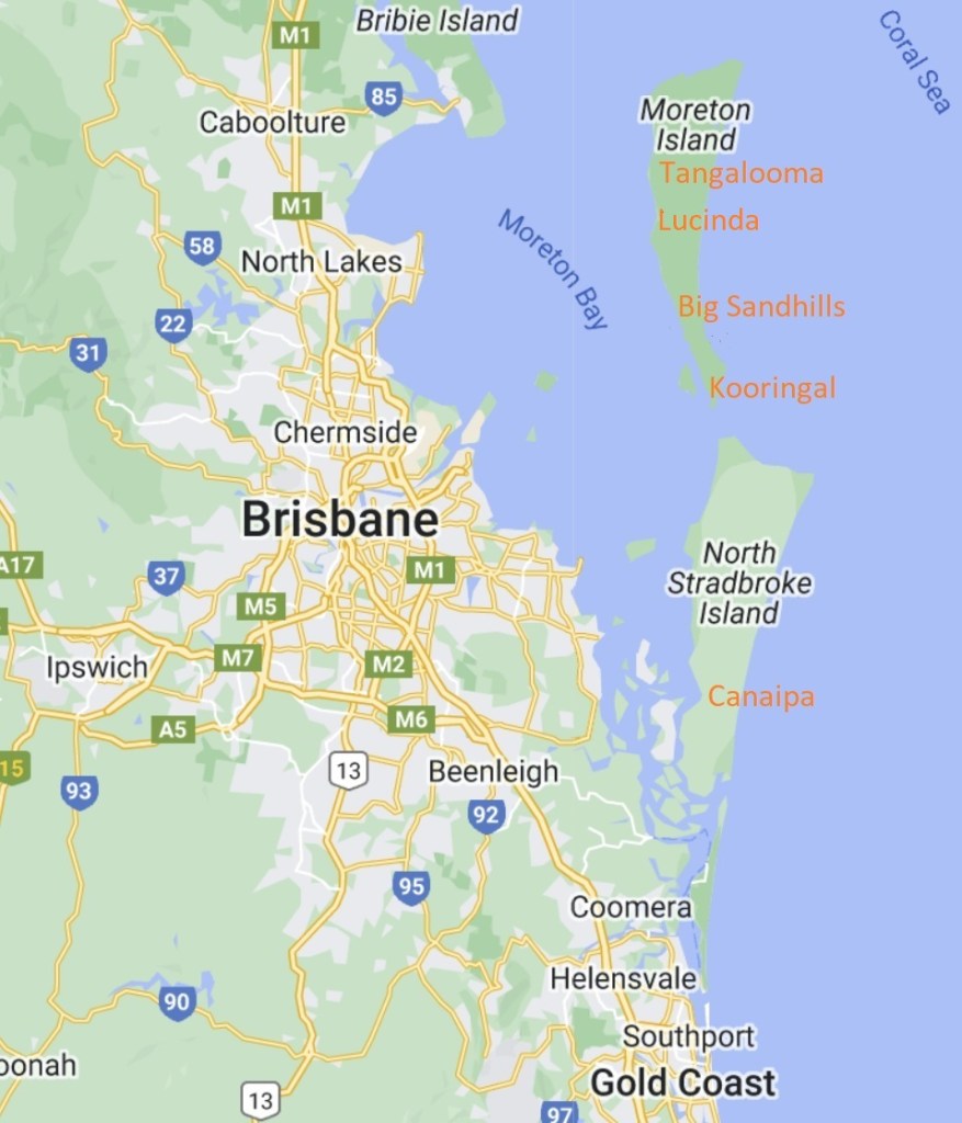 From the Sandhill anchorage we dinghied to Kooringal for Sunday fish and chips at the Gutter Bar – copious and tasty fare! Kooringal is a sleepy village at the very southern end of Moreton Island, on the edge of the passage between Moreton and North Stradbroke Islands. We managed to time our foray so there was enough water to speed through the shallows an hour either side of high tide. We saw turtles, dolphins, dozens of rays, lots of cormorants perching on the oyster leases boundary sticks, but did not meet up with the hammerhead shark nor dugong who frequent the area.