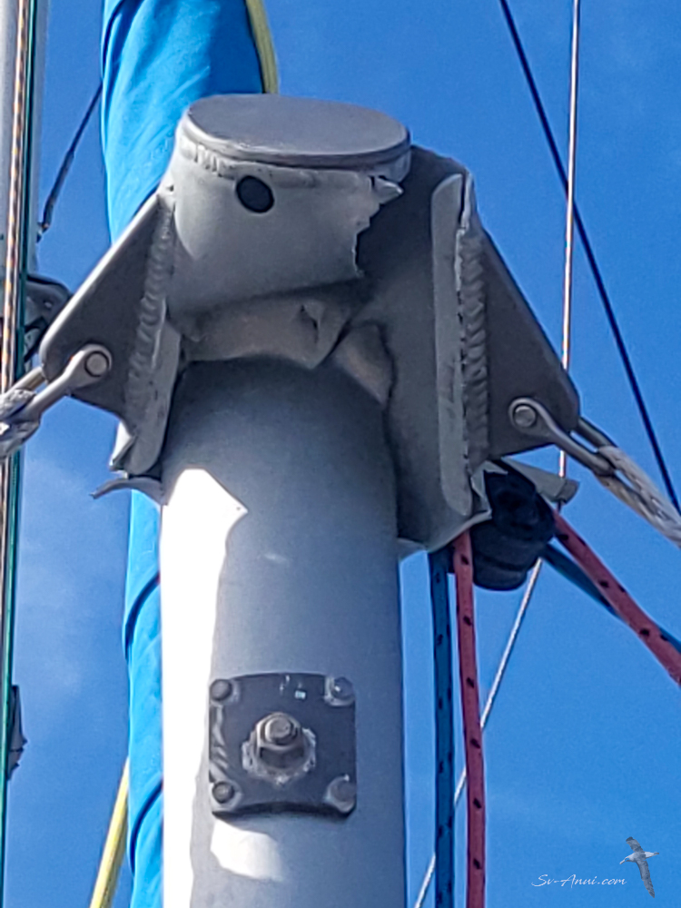 The good was a beautiful sail with the wind on our beam from Moon Point on K’gari to Burnett Heads, under mainsail and screecher, averaging a cruisy 8 knots speed. We had parcels to pick up at the Post Office, a telehealth appointment early in the week for Wade, so we thought we’d go and anchor in the Burnett River and welcome our buddies Graham & Helene on Roo Bin Esque when they arrived. It was all going swimmingly. That is until the wind went from a leisurely 14 knots apparent to 36 knots apparent (over 50 true wind) in a few seconds with a short and sharp squall. We did not see it coming and things turned to bad: blowing like crazy, raining, way too much sail up… It was all hands on deck to get the screecher down! Of course nothing works when you desperately need it to. We had the screecher partly furled when suddenly it got ugly: the aluminium prodder pole on which the screecher furler attaches failed under the extreme pressure. It jumped up vertically, its end just crumpled and bent and the endless loop furling line snapped at the splice point, letting the screecher all out again!