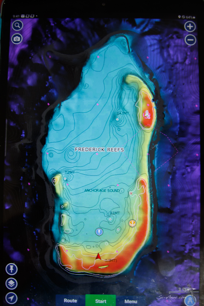 Frederick has a rim of reefs in the shape of a J with a series of cays. The Anchorage Sound is located at the southern end of the atoll. At the northeast end, there is a separate reef with a cay, the dot on the J, where a lighthouse with an unmanned weather station stands. Here is what the atoll looks like on Navionics.
