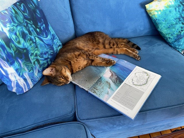 In my old age I have become more curious about other critters. I especially like watching wombats on the TV. And lately while we were offshore, a few terns have come on board without my say so and I had to restrain myself, despite being very tempted to biff them! But most of all, I LOVE my sleeps… on the goat or on my humans’ lap.