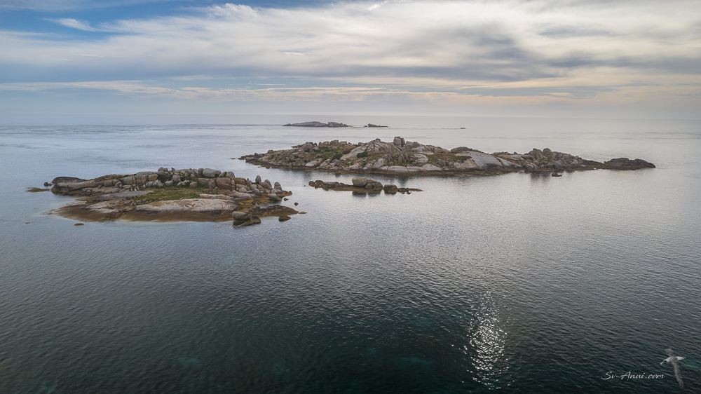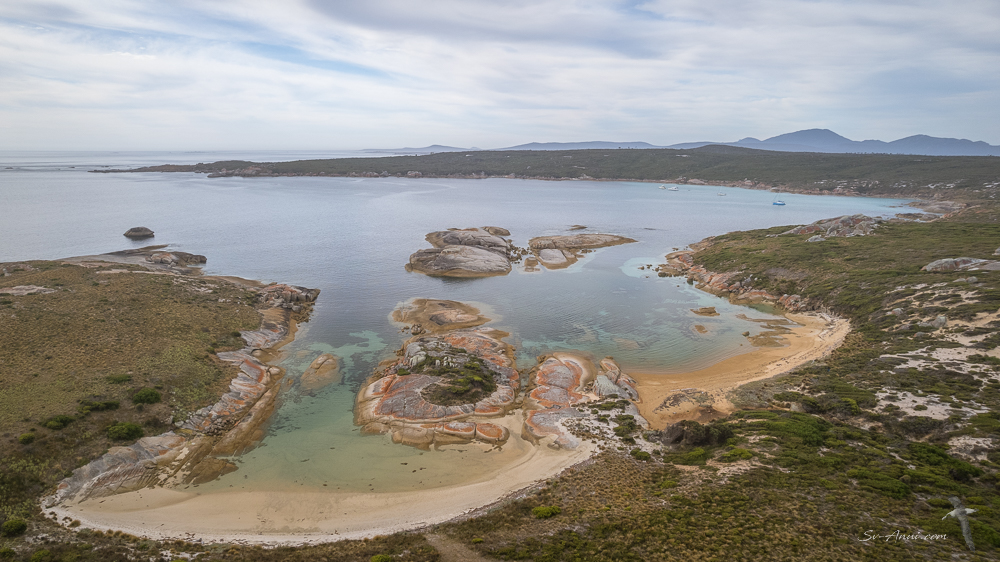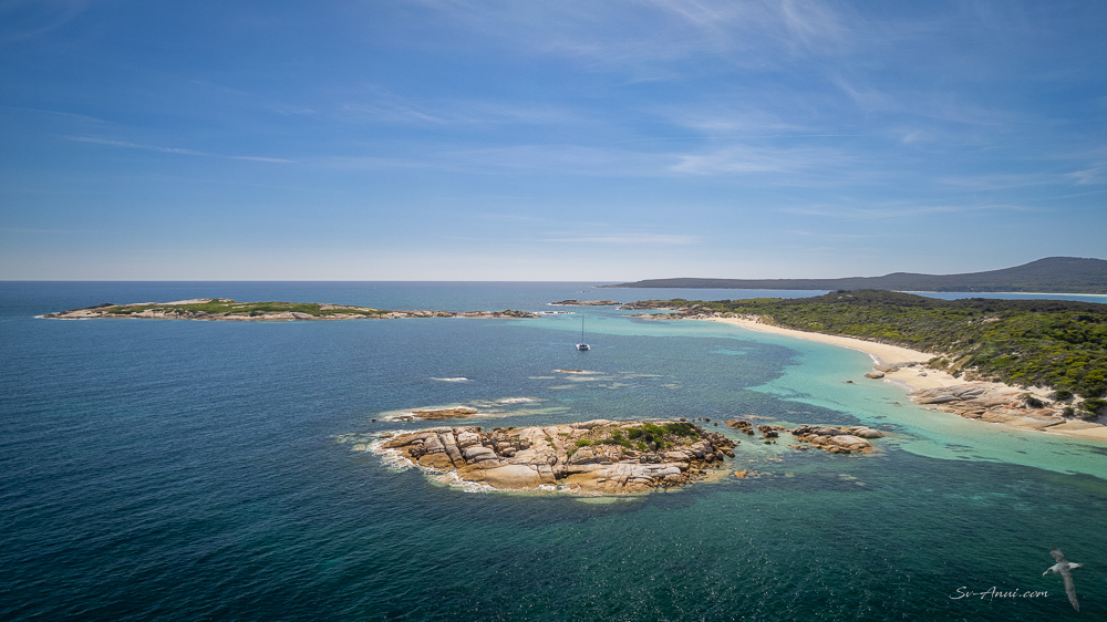 We spent four days at Spike Bay, weathering a blow there and waiting for the right conditions to cross Banks Strait towards the Tasmanian northeastern shores. Here are a few aerials of this enthralling place.