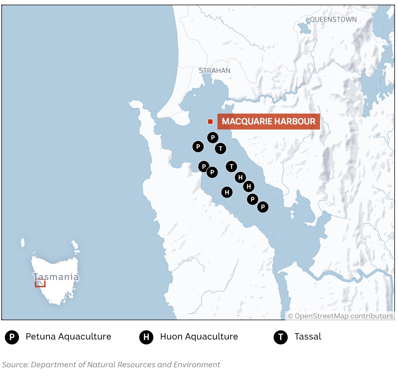 A more recent feature of Macquarie Harbour has been the establishment of salmon farms in the 1980s. They are spread across the length of the harbour and production increased significantly in the 21st Century.