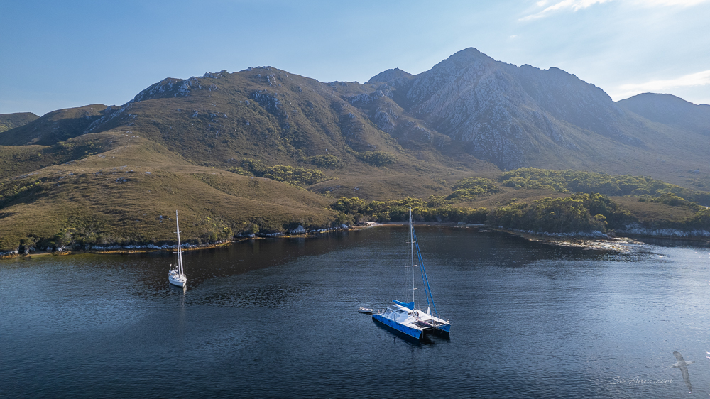 Our last anchorage in Port Davey before heading into the Bathurst Channel was at Bramble Cove. This cove is overlooked by Mount Stokes on the eastern side, 484m high, and the entrance to the cove is protected by Mount Milner (186m) with its steep ridge line climb. We have no photos to show for the effort as Chris wiped them out without realizing! We have a few aerials though!
