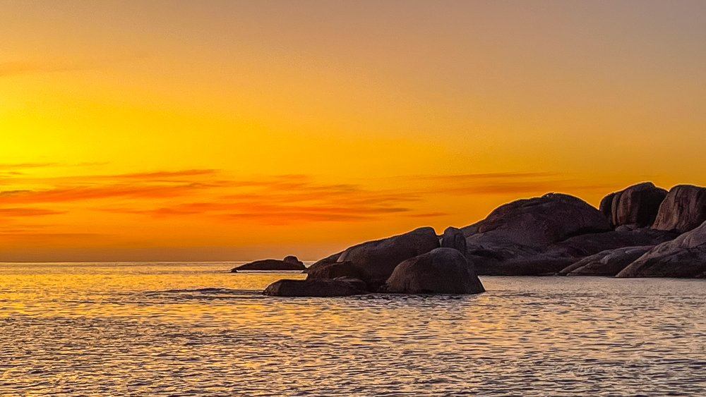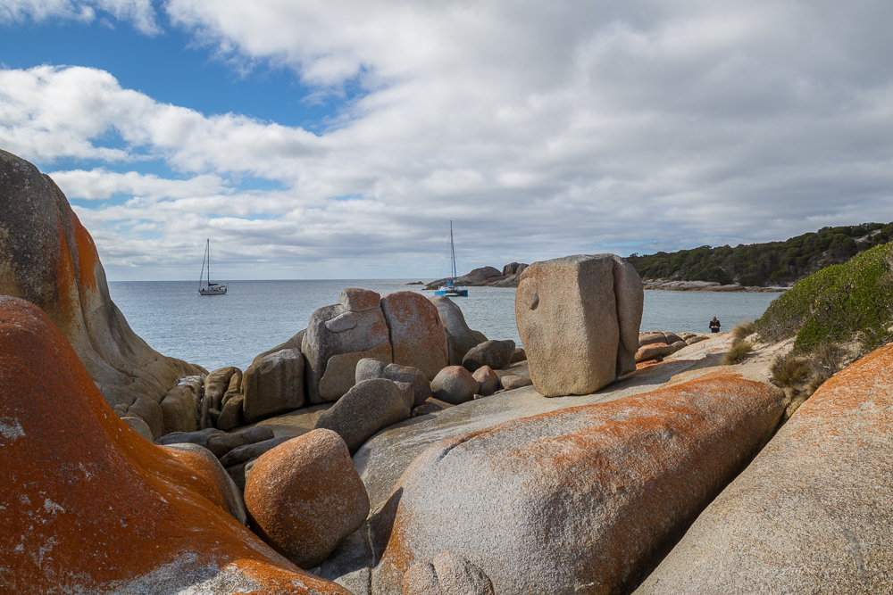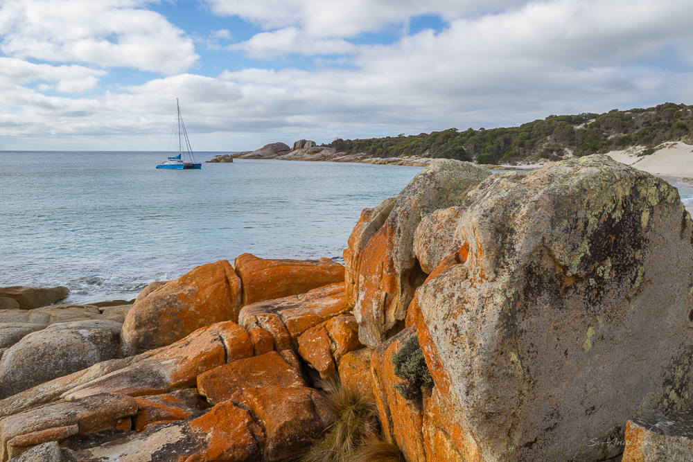Jamieson Bay is a very scenic anchorage, with sandy beaches and granite outcrops covered in the characteristic orange lichen of the Bass Strait islands. A beach walk and scrambling over the boulders really highlight how bright and striking they are.