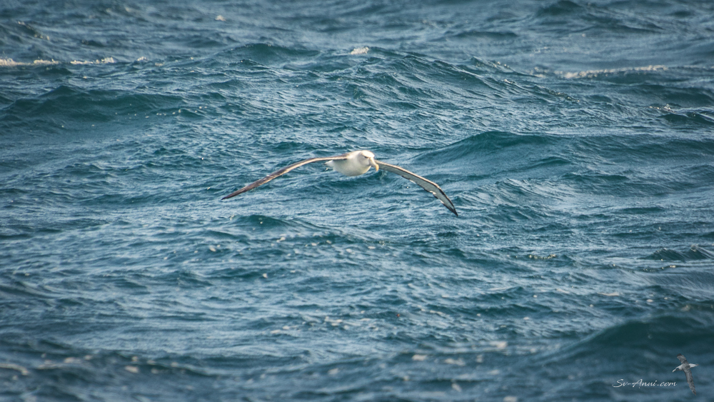 We started our last passage for the entire voyage in the early afternoon on Saturday to reach our Gippsland Lakes destination in good time for the bar crossing. As soon as we upped anchor at the Outer Sister, it was ON: 20-25knot wind, 2m swell on the beam. We had two reefs in the main, a rolled up jib, were averaging 9 or 10 knots speed and it was boisterous – which also means lots of albatrosses about! Unfortunately this is the only photo we managed, such were the conditions in daylight. By the time it calmed down enough not to get a drenched camera, it was dark!