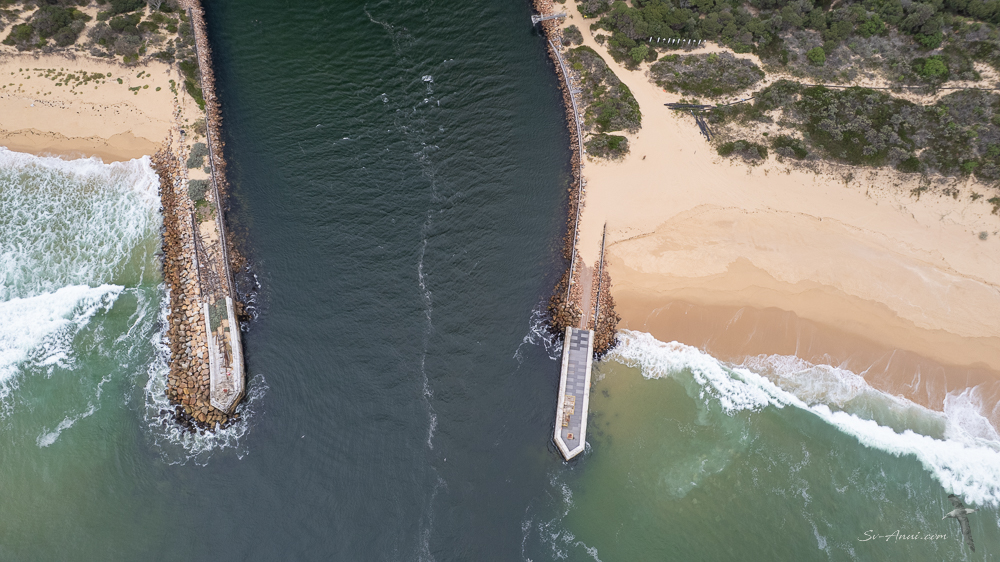 Just for interest, we sent the drone up to take shots of the entrance while we were moored in the Cunningham Arm in front of the Lakes Entrance township, so you can see what it looks like from above.