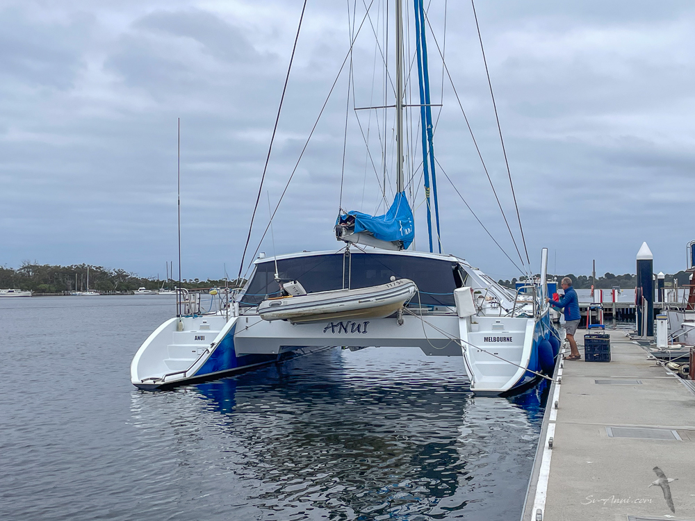 By 8am, Chris brought the boat along the floating jetty at our favourite spot in front of Paynesville. It took another half hour to fiddle with the mooring lines and for the skipper to declare he was happy!
