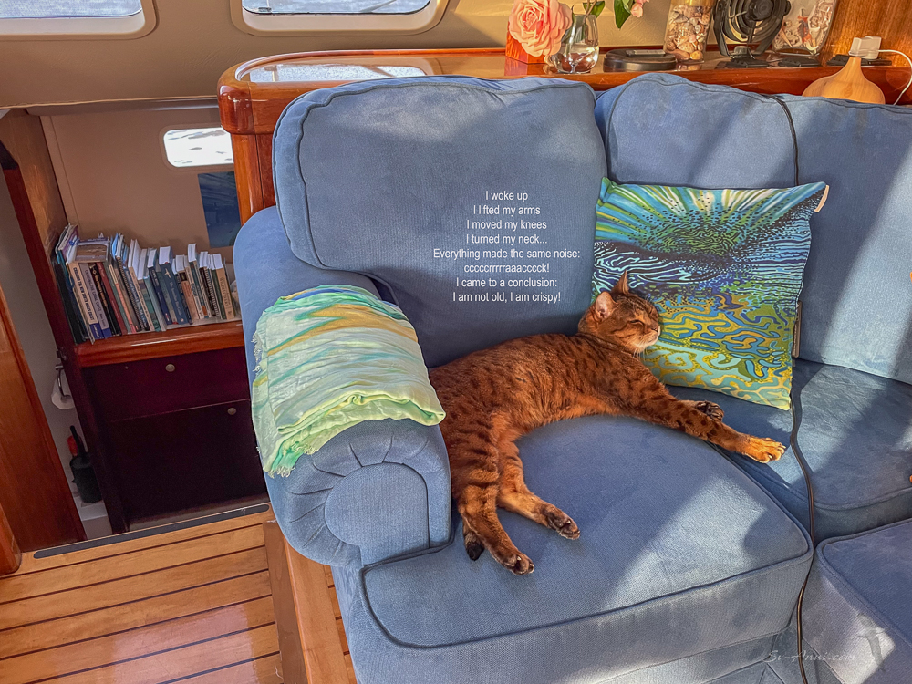 Talking about accelerated aging, Bengie is not immune to it either. At 18.5 years old (over 90 in human years) she has her own aches and ailments: renal disease, arthritis in her legs… these days she does more sleeping and cuddling on our lap than going for dinghy rides and walks on the beach.