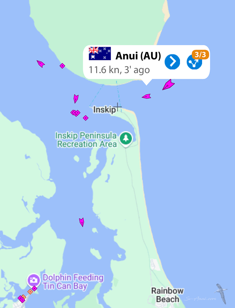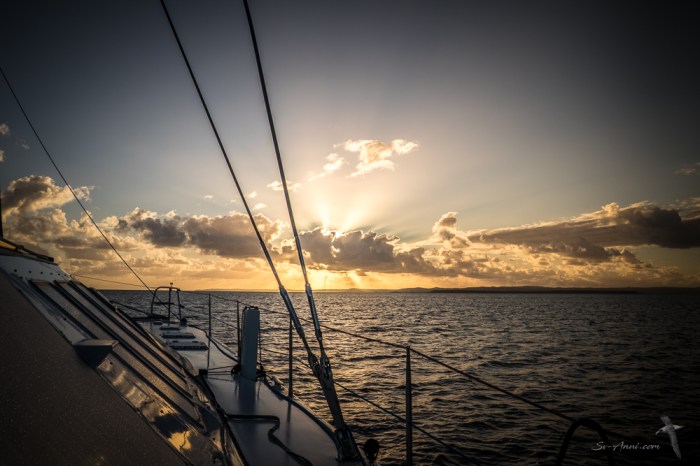 A short window to progress north presented itself and we were off. Our first hop was to the northern end of Moreton Bay, at Yellow Patch, which was a rather rowdy anchorage, even for us! A reason for smiling though: a feathered visitor – a pied cormorant – landed on the sugar scoops and proceeded to waddle around the deck. Bengie was fast asleep!