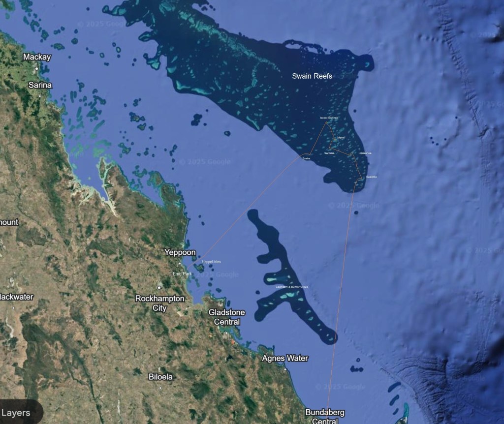 With gusts of over 30 knots forecast offshore for several days, it was time to head back inshore and hide behind an island! We left overnight and used the last of the calm conditions to motor 120nm towards the southwest while there was hardly any breeze and are now at the Keppels. Had we been prepared to instead go further north towards the Percy Isles, we could have stayed another few days before the serious blow, but we wanted to position ourselves for another trip to the Swain Reefs with other cruising friends and at this time of year it is best done from the south, not the west.