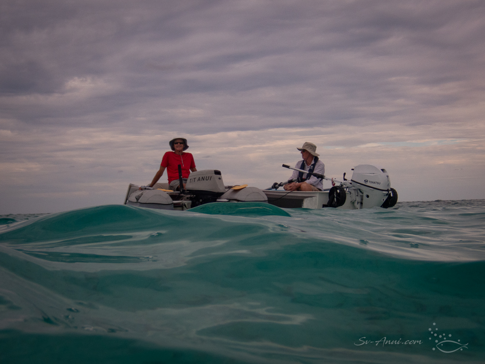 The greyness did not stop the girls from having a snorkel while the boys chatted in the dinghies! Mike has hurt his back and Wade has sliced through his finger filleting fish, hence them choosing to stay out of the water for a few days.