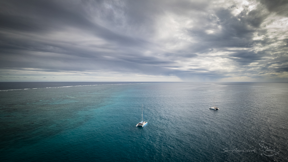 We had never been there before, but thought it could be a handy arrival point at the Swain Reefs next time around and wanted to check it out. The access is easy and unobstructed; however it is deep: mostly 10 to 12m+ along the narrow sand strip bordering the reef edge and it quickly drops to 20m. It offers some protection from the southeast trade winds, although being on the very southern edge of the Swain Reefs, there is some swell at high water. We managed to fit in a drone flight, despite the threatening skies.