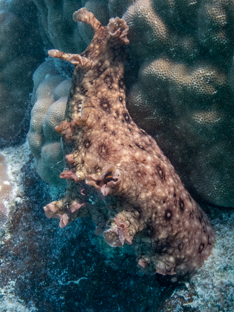 The change in weather is rather tedious. We are passing the time as best we can: island walks, lots of reading and binging on Netflix, snoozing and the odd snorkel at low tide. The coral here is quite damaged but the NW wall in the green zone still shows large expanses of Porites mounds and Merulina. With the strong wind, it was a bit hard going and the visibility was ordinary but two types of critters caught our attention: a school of tiny Pacific Blue Eyes and a Sea Hare, a type of sea slug we had not seen before. Their large rounded body shape and the long rhinophores on their head mean that their overall shape resembles that of a sitting rabbit or hare.