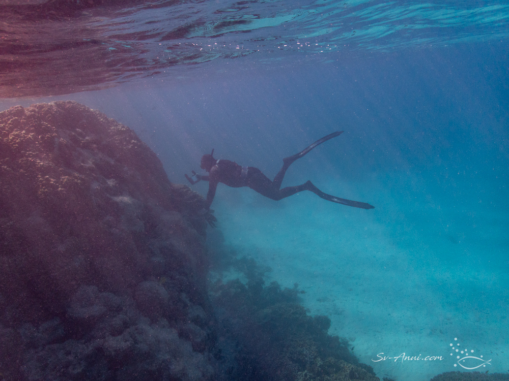 Although the coral lacks vibrant hues there are large expanses of live Porites and Merulina in monochrome beige, frequented by colourful fish and endearing turtles: