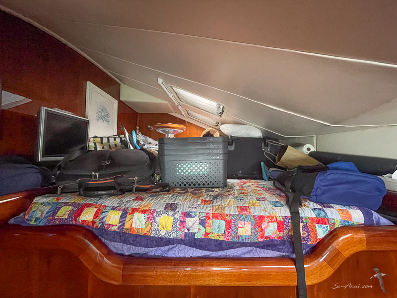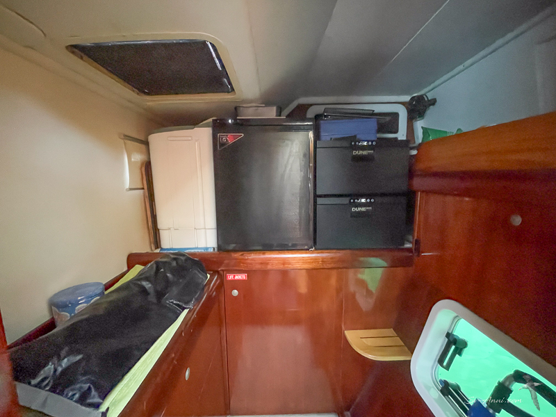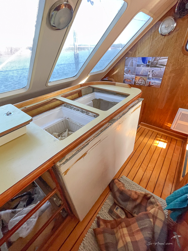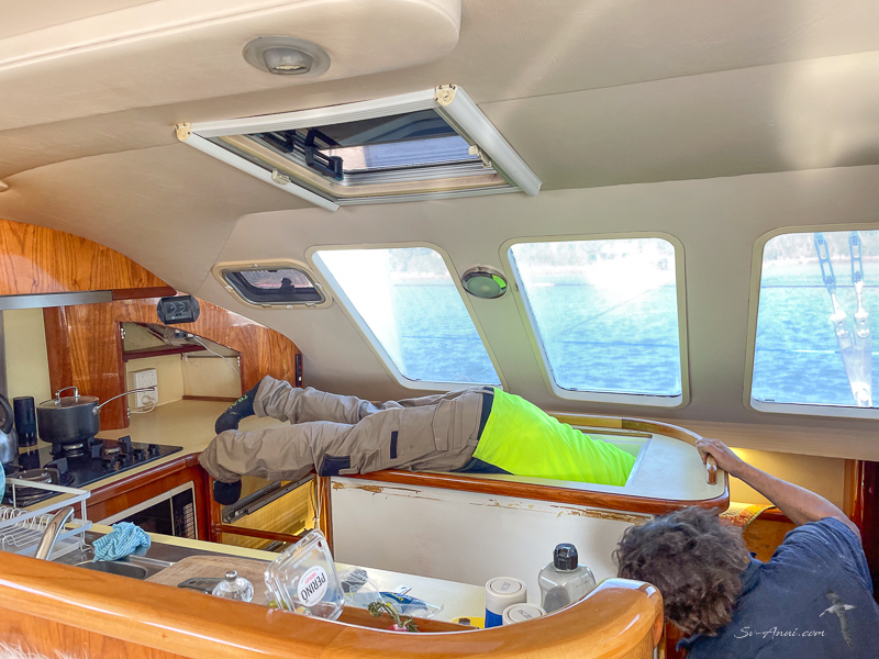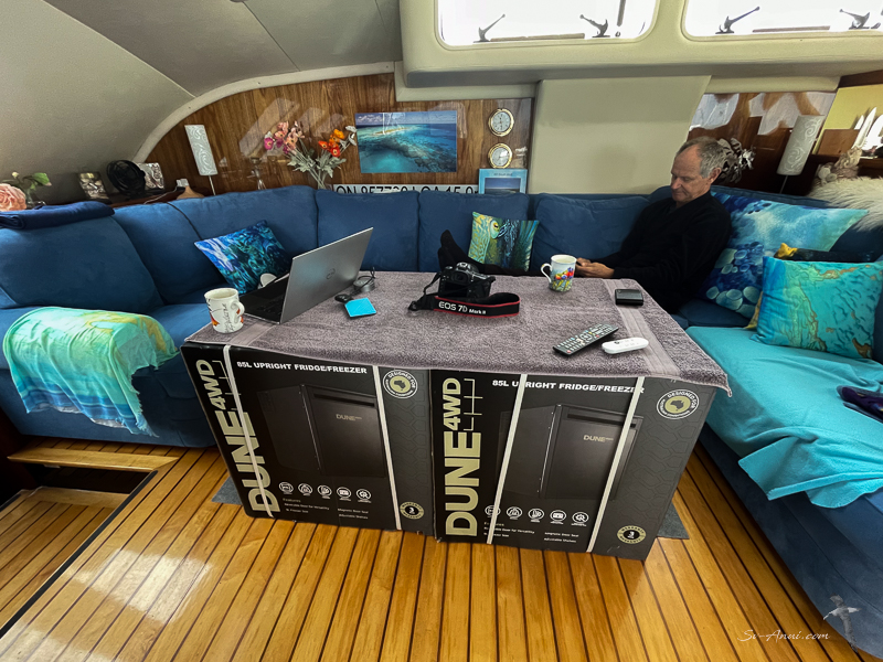 With limited space in the galley, we are replacing the unit with two 85l Dune 24 Volt fridges, side by side, front opening, and have also bought two drawer-freezers which are operating in the back storeroom and are so practical. Before leaving the marina, we bought the fridges, the freezers and some rolls of Laminex. While we stored all of this on board, you can imagine what the guest cabin looked like, not to mention the saloon… We made do with the cockpit fridge and the two new freezer drawers for refrigeration on this trip.