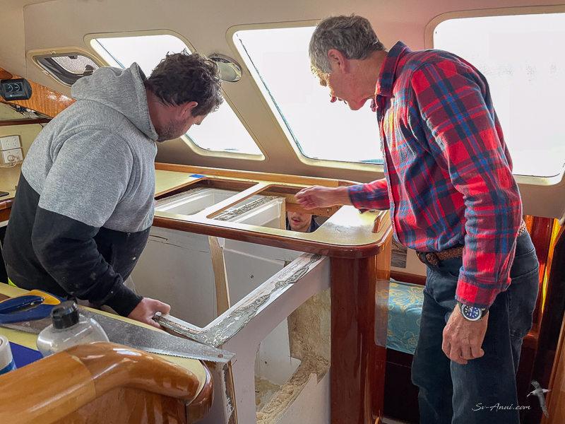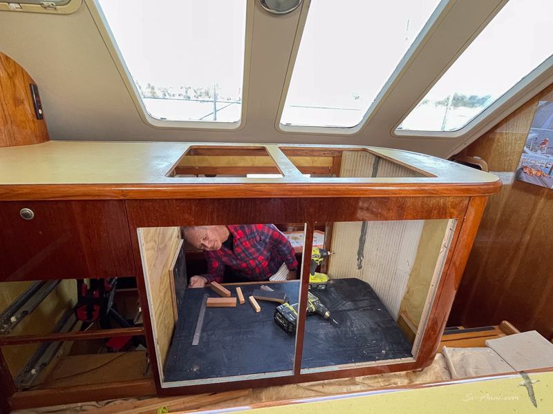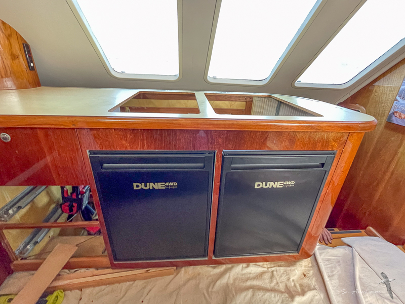 And once it was out, the bench needed to be braced, which kept the guys busy for a couple of days. They strengthened the bench framework, made a solid base for the fridges to sit firmly in place, cut the cedar panel to fit around them so it all looks good, then worked out how to affix the two fridges to the base so they don’t move underway. It was a fiddly job.