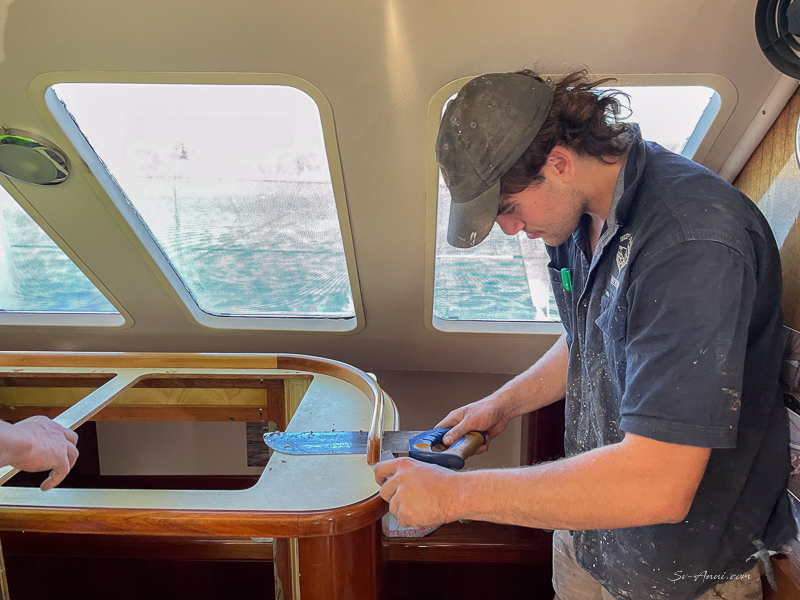 It was time to prep for the new laminate. They carefully removed some of the wood trims, and patched the holes where the old lids used to be, so the benches are ready.