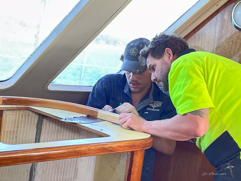 No matter what we replace it with, the original unit has to come out and it means a change to the cabinetry and the benches. The team for this delicate job is Tim Heaney, our Shipwright from Frecheville Heaney Boats with his very experienced cabinet maker David and second year apprentice Charlie. We are counting on them to do their magic so we end up with a practical set up that does not look like it has been cobbled together.